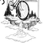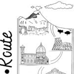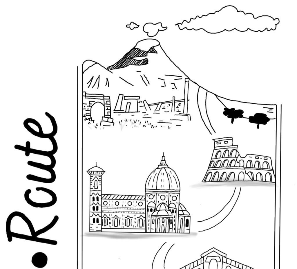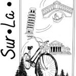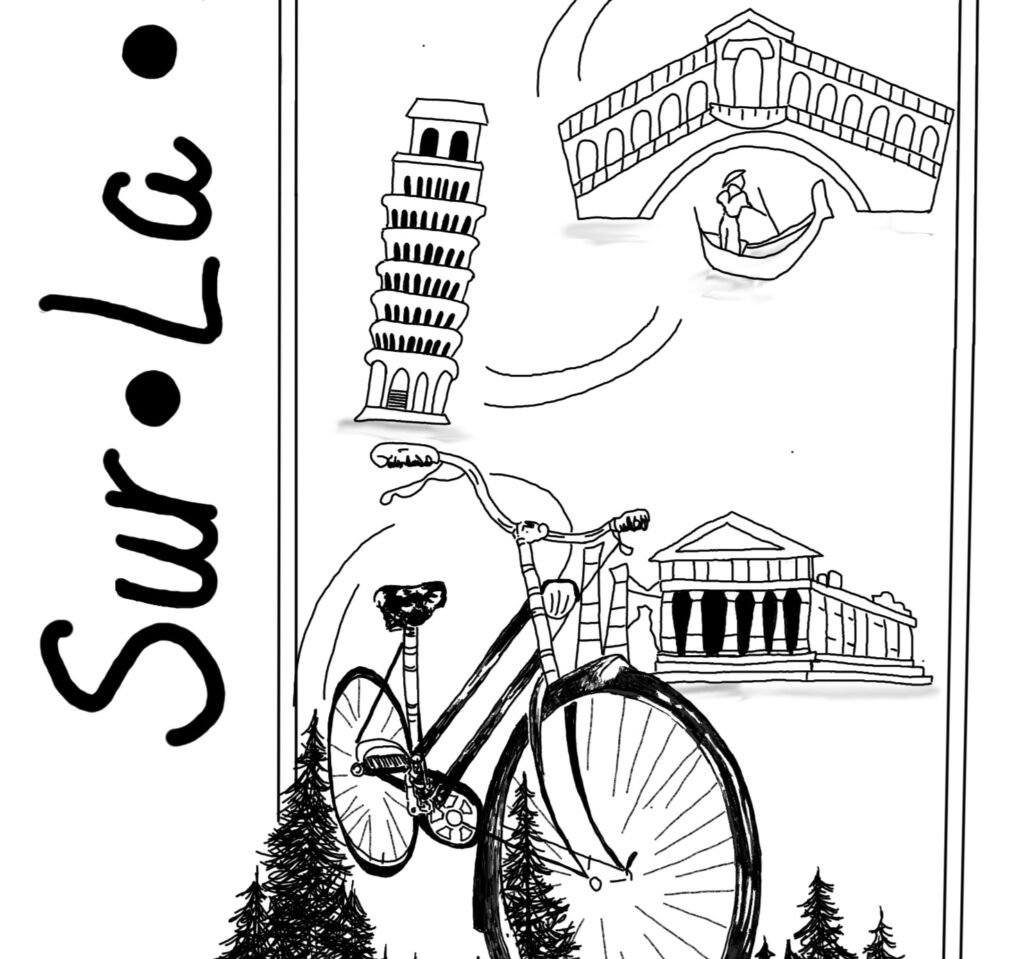 Black-and-white contemporary illustration depicting a traveling art project by bicycle across Italy. At the center, a large bicycle stands on a floating island covered with pine trees, suspended above clouds with a waterfall cascading downward. Surrounding and above it are ink-drawn Italian landmarks — Mount Vesuvius and Naples, the Colosseum in Rome, Florence Cathedral, the Leaning Tower of Pisa, the Rialto Bridge in Venice, and a classical temple. The handwritten title “Sur La Route” runs vertically along the composition. Symbolic artwork evoking slow travel, Italian cultural heritage, and eco-conscious mobility.